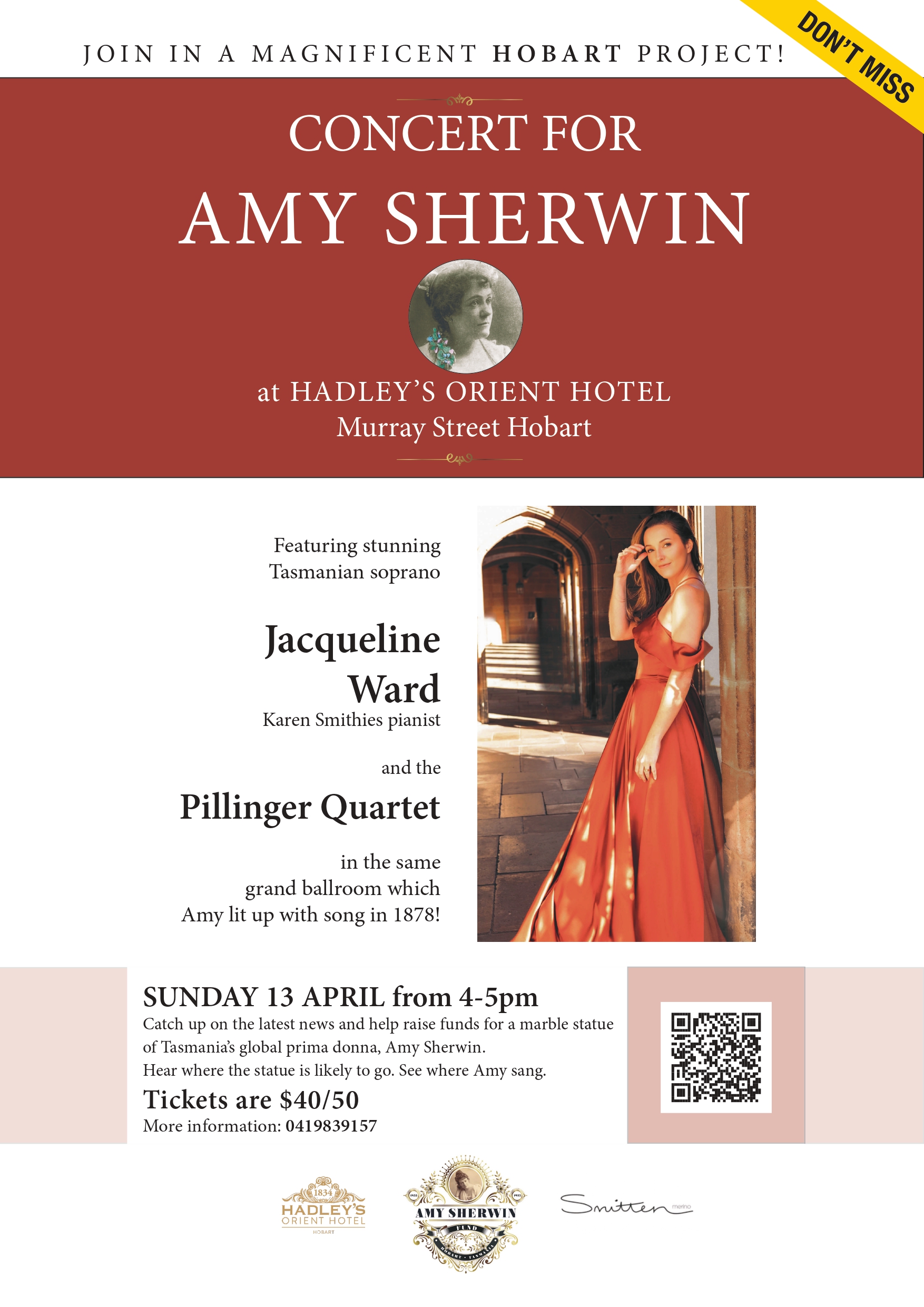 Join us for an unforgettable evening as Tasmanian soprano Jacqueline Ward and Pillinger Quartet pay tribute to Amy Sherwin, ‘The Tasmanian Nightingale’, in one of the historic rooms at Hadley’s Orient Hotel she performed in over 100 years ago. Enjoy a welcome drink on arrival as Pillinger Quartet accompany Jacqueline Ward in a small number of arias, as well as playing an item for quartet alone. This event will raise funds for the Amy Sherwin Fund in their quest to immortalise Amy Sherwin.